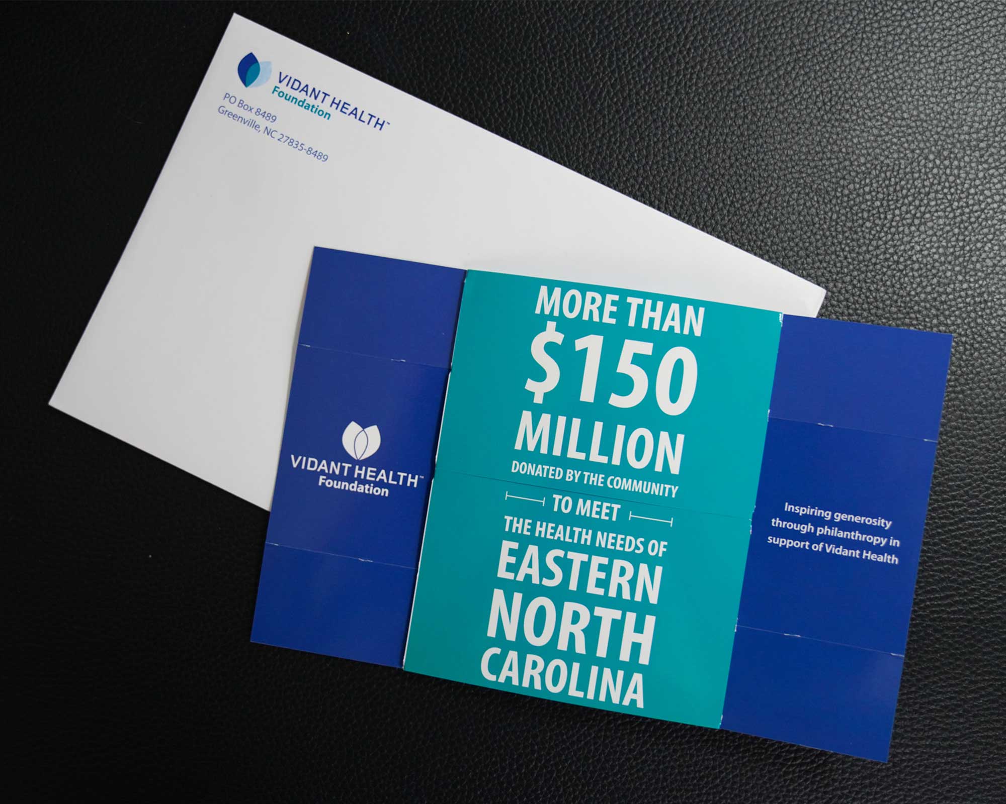 Vidant Health 40th Anniversary Mailer – When Vidant Health came to Igoe Creative for their 40th Anniversary mailer our team had a unique and interactive design idea. This mailer is printed on an infinity fold which continues to unfold no matter how long the user interacts with it. This design and unique printing method keeps audiences engaged with the message presented.